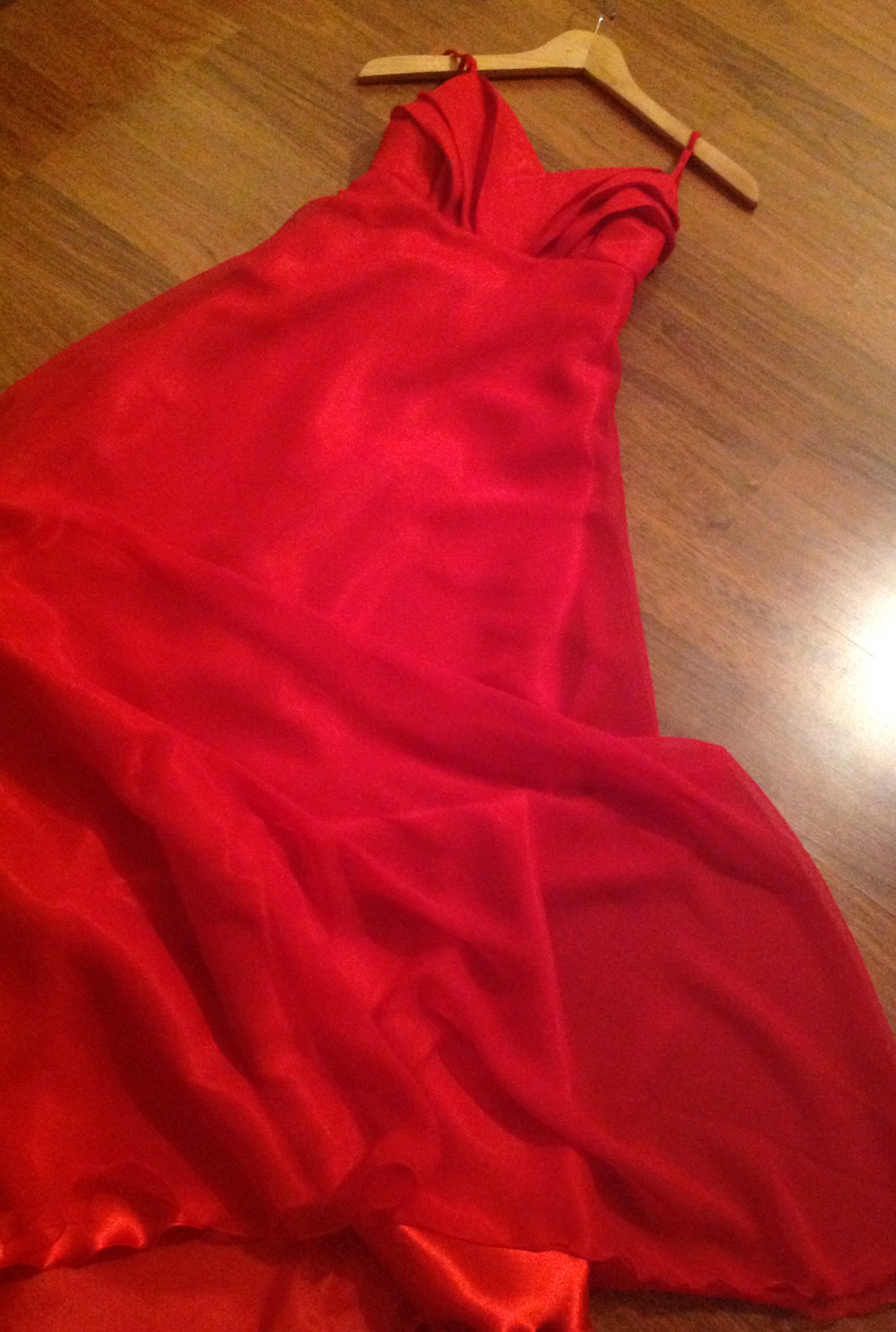 Puvun salaisuutena on vinoonleikatut helmat, sekä erillinen yhdestä kappaleesta valmistettu päällikerrossifonki. Näin vältyttiin muotolaskoksilta ja ylimääräisiltä saumoilta. Puvun takaosa muodostuu syvään uurretusta selkäosasta sekä ristikkäin menevistä olkaimista, lisäksi helmaosa on takaa huomattavasti runsaampi kuin etuosa.