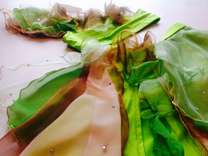 Eilen sovitimme tätä metsänhengen show dance -pukua. Sovituksen jälkeen tuli vielä pikku muutoksia sekä strassien kiinnitystä. Siinä hurahti muutama tunti kunnes asu tuli valmiiksi ja on valmis luovutettavaksi. Tuskin maltan odottaa, miltä se näyttää esiintymispäivänä, kun tanssija astuu estradille.