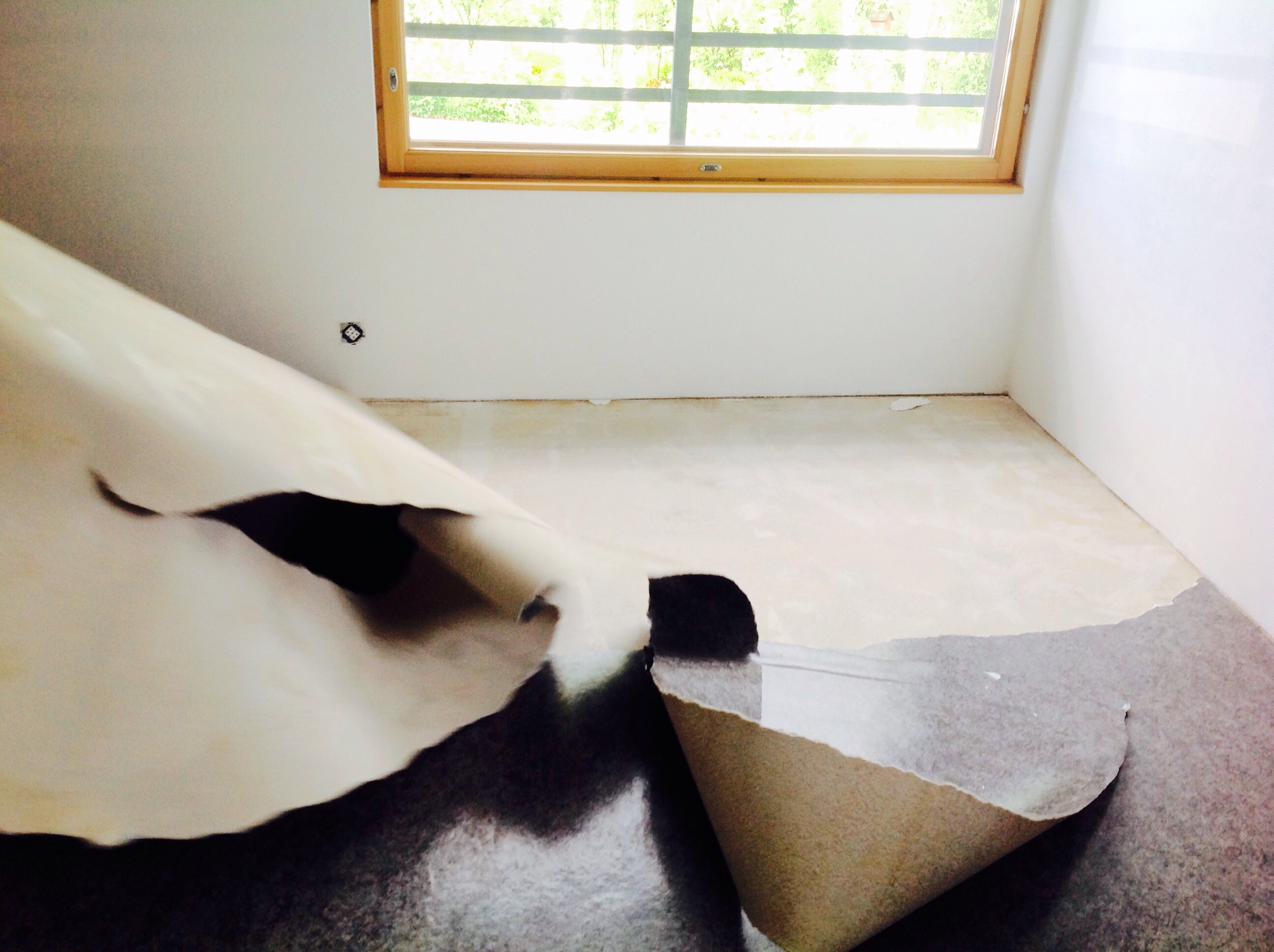 Jännitimme muovimaton alla ollutta liimakerrosta. Onneksi turhaan, sillä liima lähtikin melkeinpä kokonaan muovimaton kanssa pois. Seuraavaksi betonin pinta pitää hiertää tasaiseksi ja primeroida.