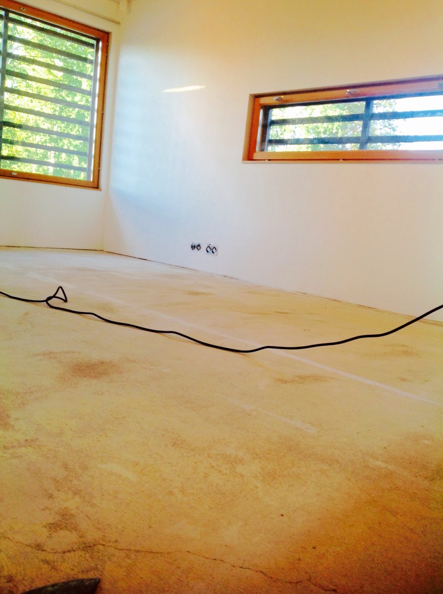 Primeroinnin jälkeen lattialle levitetään sementtipohjainen lattiapinnoite. Pinnoite puhdistetaan ja pinnoitetaan viimeistelyaineella. Nähtäväksi jää, miten onnistumme pinnoitteen kanssa. Loppu viikosta lattian pitäisi olla valmis.