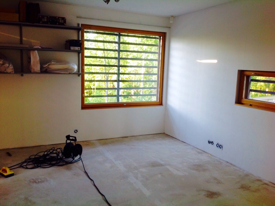 Näyttäisi siltä, että työhuoneeni valmistuu ajallaan. Sain viikonlopulla maalattua huoneen seinät ja nyt seuraavaksi on lattian vuoro. Ensi töikseen lattiasta piti poistaa laminaatti, joka poistettiin jo muutama viikko sitten. Tänään poistettiin laminaatin alla ollut muovimatto.