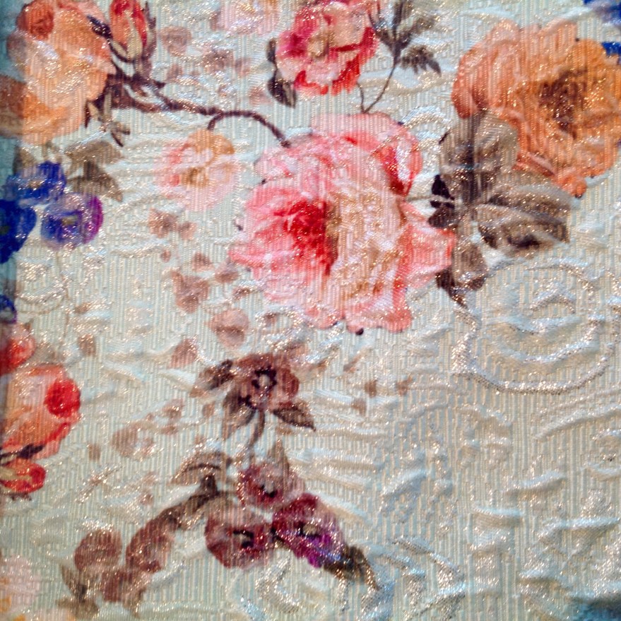 Minun oli tarkoitus suunnitella ja valita kankaat konfirmaatiomekkoon. Aluksi katselin pelkästään erilaisia valkoisia kankaita. Ehdin jo innostua kankaista, joissa oli mielenkiintoisia pintastruktuureja. Jos itselläni olisi ollut tarve ostaa valkoista kangasta, olisin päätynyt ihanaan silkkiin. Tässä kankaassa oli mielenkiintoisia kohokuvioita, jotka muodostivat vähän ruusumaisen pinnan.