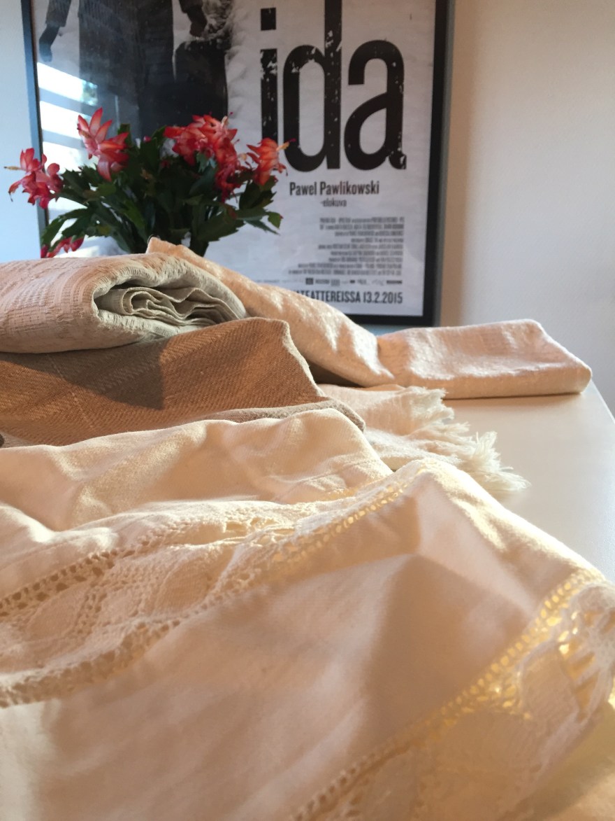 Sain syksyllä kassillisen vanhoja pöytäliinoja. Näistä pöytäliinoista sain tehtäväksi valmistaa joululahjaksi kylpytakit. Materiaalit olivat kestäviä ja hyväkuntoisia. Pellava oli joissain saumoissa niin vahvaa, että katkaisin ommellessa jopa kolme neulaa, mikä on erittäin harvinaista.