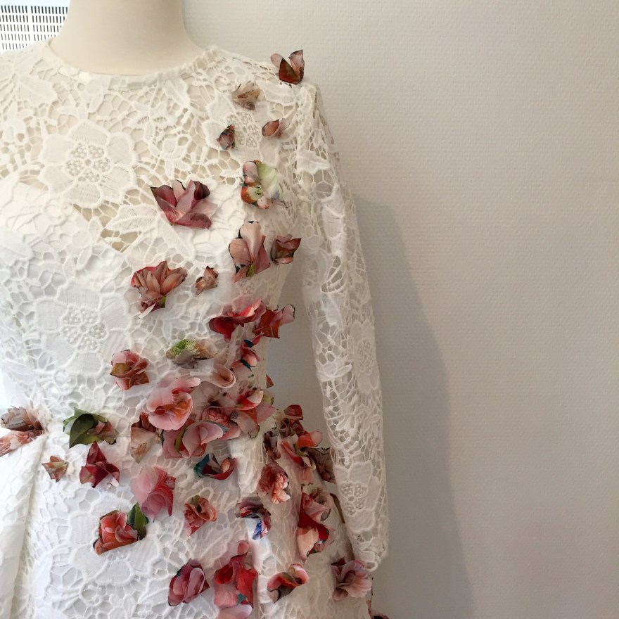 Puvun jokainen silkkikukka on leikattu, muotoiltu ja ommeltu käsin. Tälläistä tekemistä ei voi saada keltään muulta kuin luovalta, hullulta, käsityöläiseltä. Lopulta olin jo melko väsynyt ompeluun ja onnekseni jouduin lopettamaan ompelun silkkikankaan loputtua. Tämä koristelu oli myöskin se vaihe, jonka halusin ehdottomasti tehdä itse.