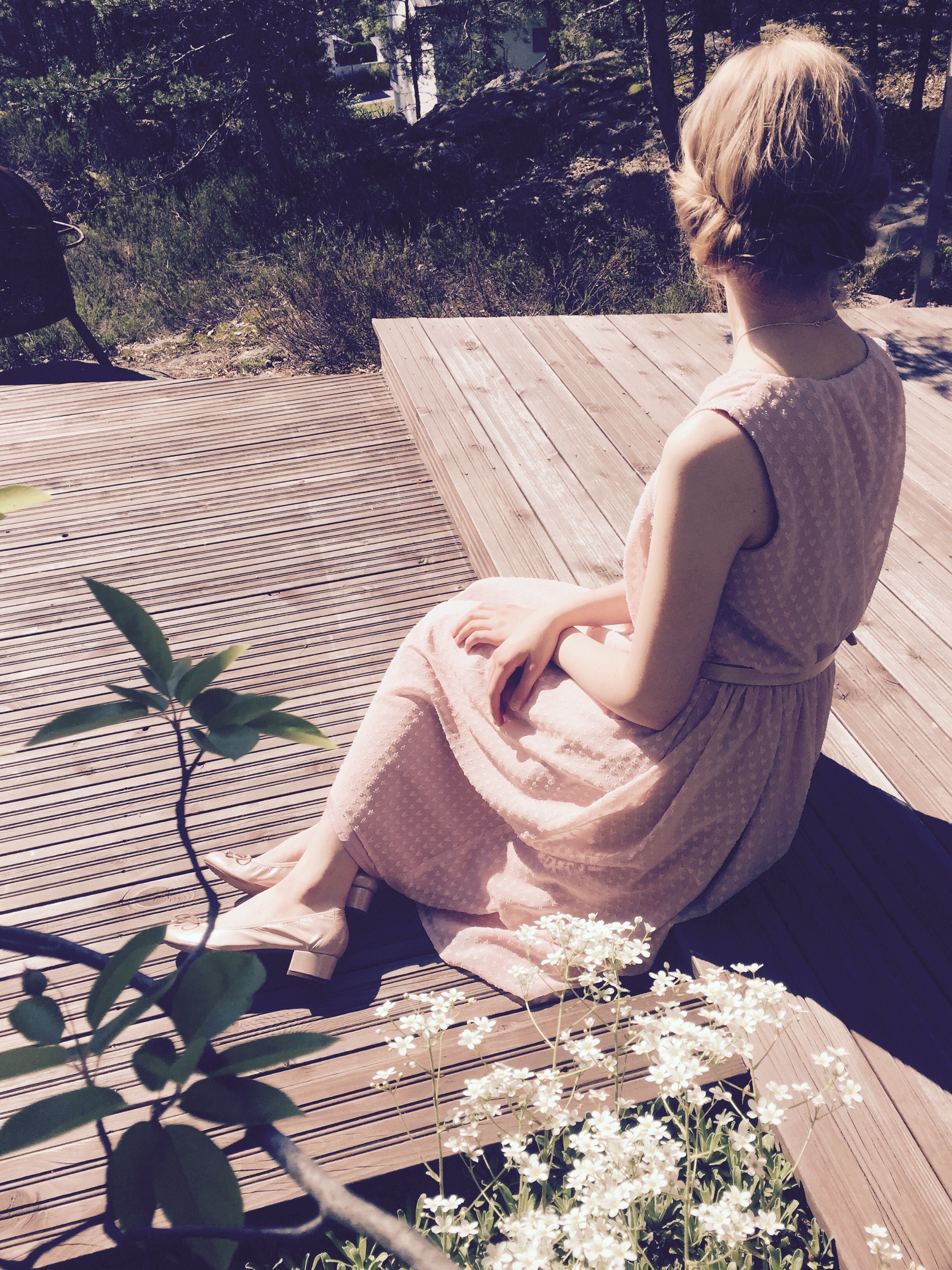 Mekkoon löytyi sopiva, kaunis vyö sekä kauniit kengät. Alunperin taisi toivomuksena olla mekkokankaasta tehty vyö, mutta mielestäni oikeanlainen vyö tuo sopivaa kontrastia herkkään sifonkiin ja samalla ”sitoo” kengät asukokonaisuuteen.