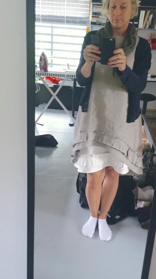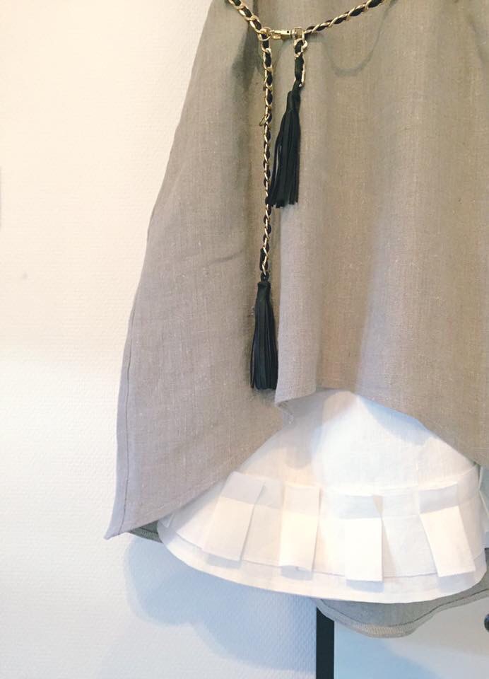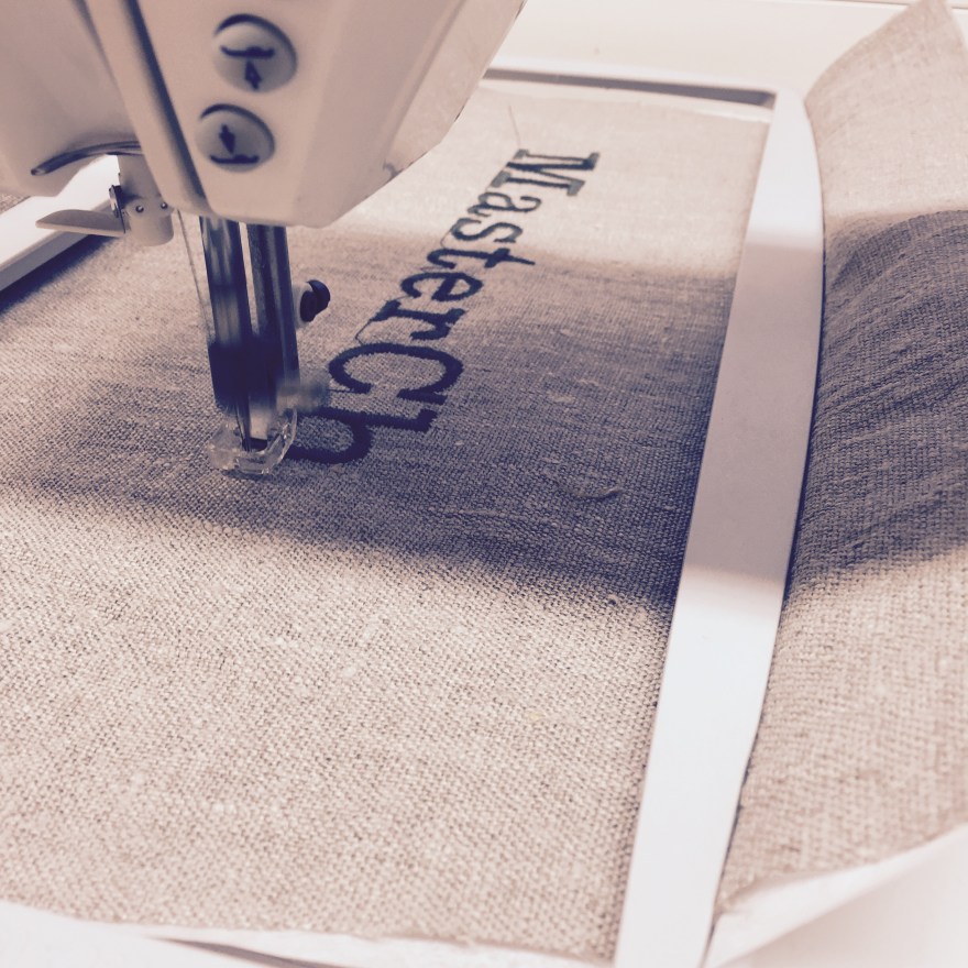 Ensimmäisen juhlaviikonlopun lahja on perinteisen mallinen suutarin esiliina. Esiliinan materiaaliksi valitsin pellavan, juurikin pellavan hyvien ominaisuuksien puolesta – kestää hyvin pesua ja kulutusta. Esiliinaa koristaa konekirjonta, joka kertoo hyvän ruuan arvostuksesta sekä on nimetty lahjan saajan kotipaikan, sekä nykyisen vapaa-ajan viettopaikan mukaan.