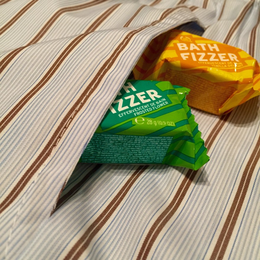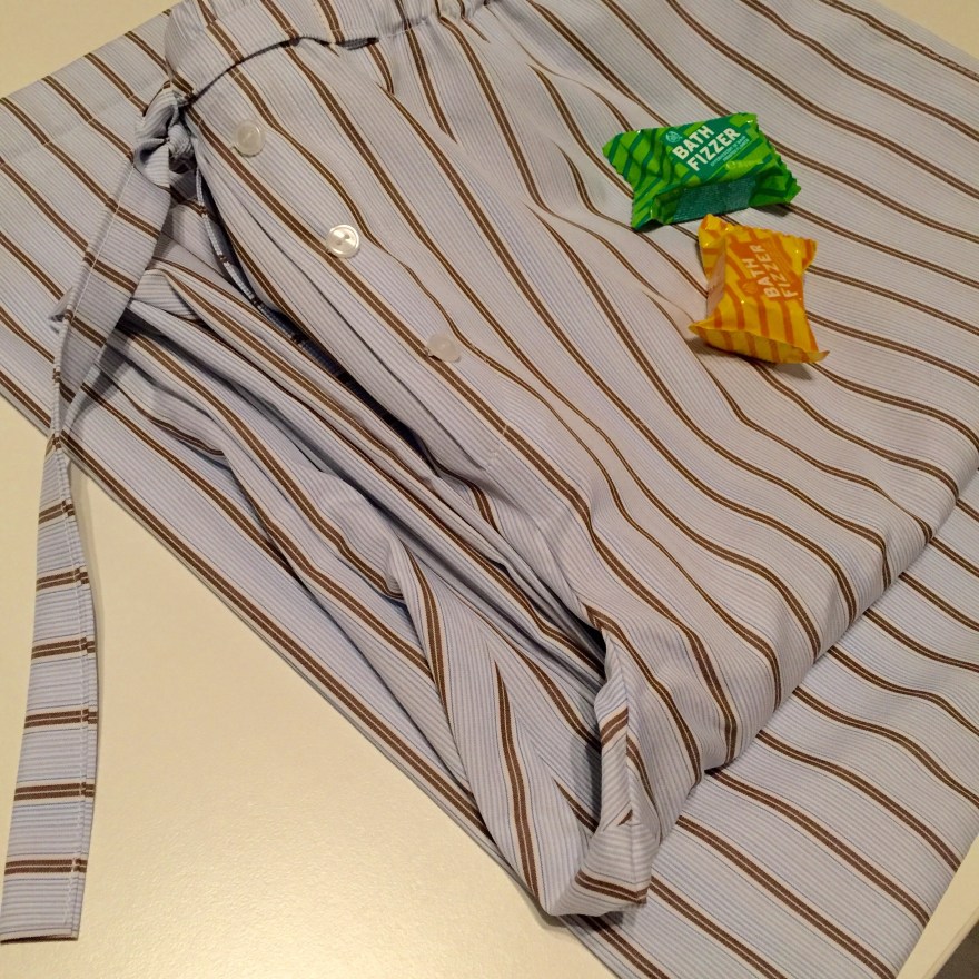 Housujen lisäksi toisesta kankaasta riitti materiaalit vielä kahteen pyjamapussiin. Laitan housujen taskuun vielä muutamat Body shopin kylpyporeet ja näin lahjat ovat valmiit.
