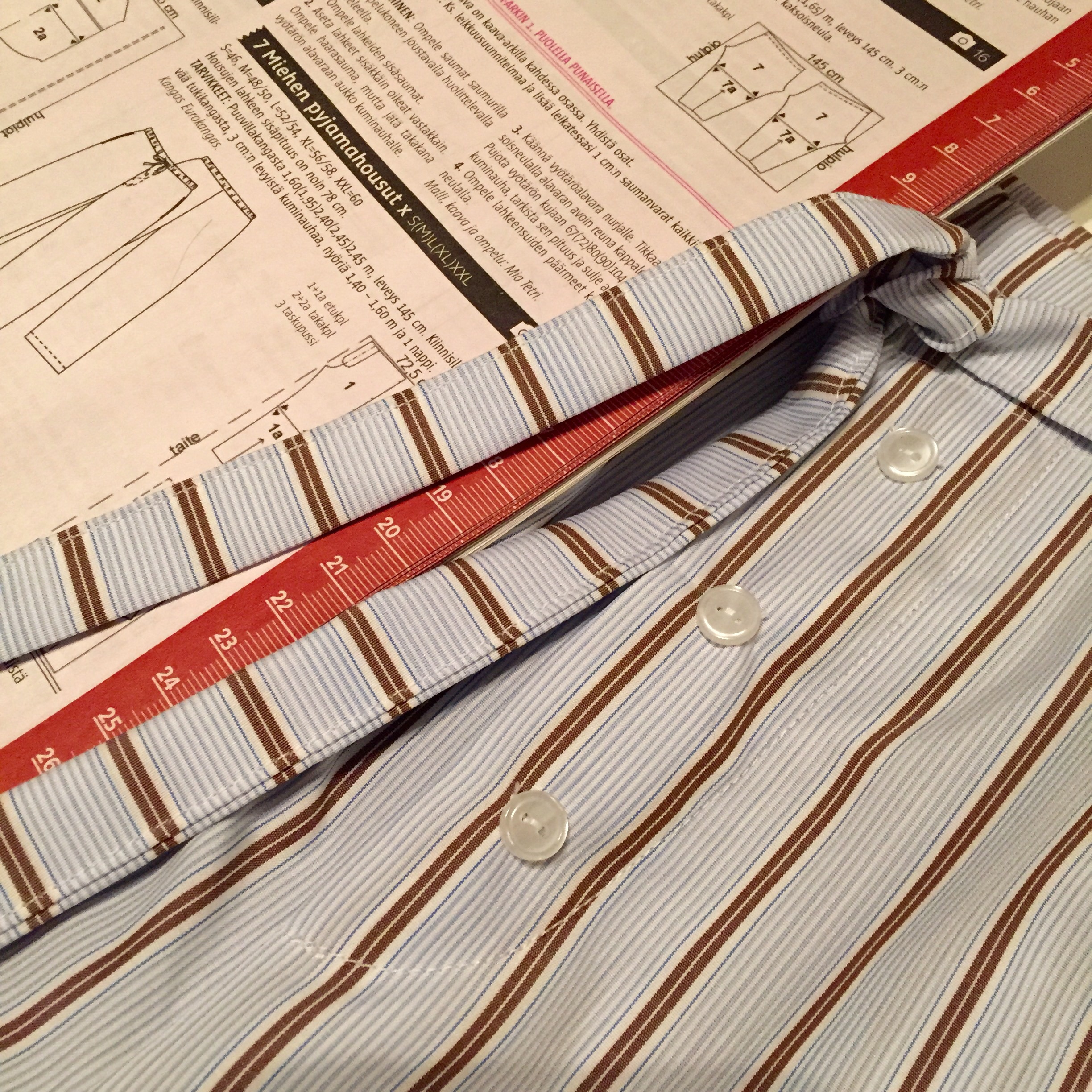 Tänään ompelinkin neljät miesten pyjamahousut valenapituksella ja sivusaumataskuilla. Sellon Eurokankaan ystävällinen myyjä ohjasi flannelikankaista ohuiden italialaisten 100% paitapuuvillojen luokse. Sieltä löytyikin kaksi mieleistä kangasta, joita molemmista tosiaankin ompelin kahdet housut.